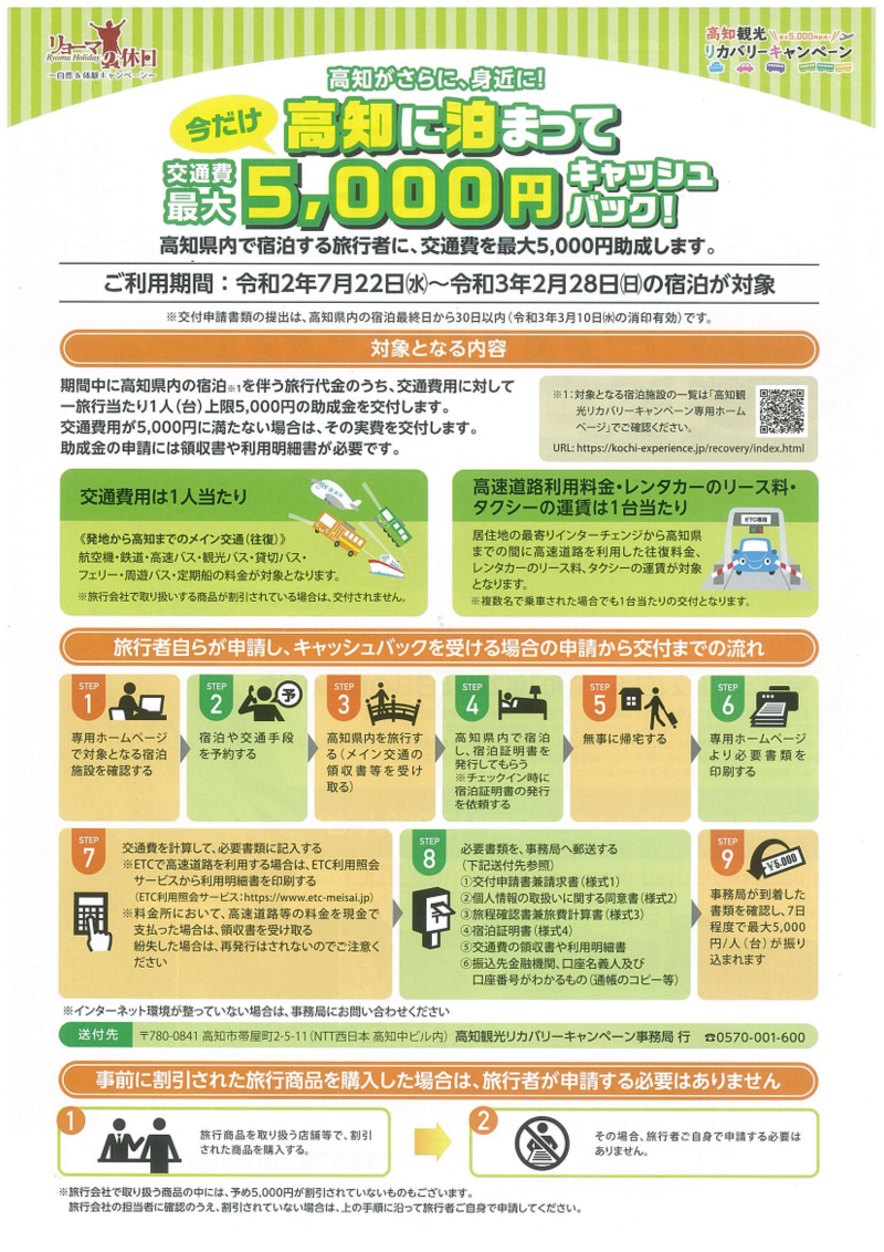 尚、高知県の5,000円キャッシュバックは旅行後お客様ご自身で申請していただきます。