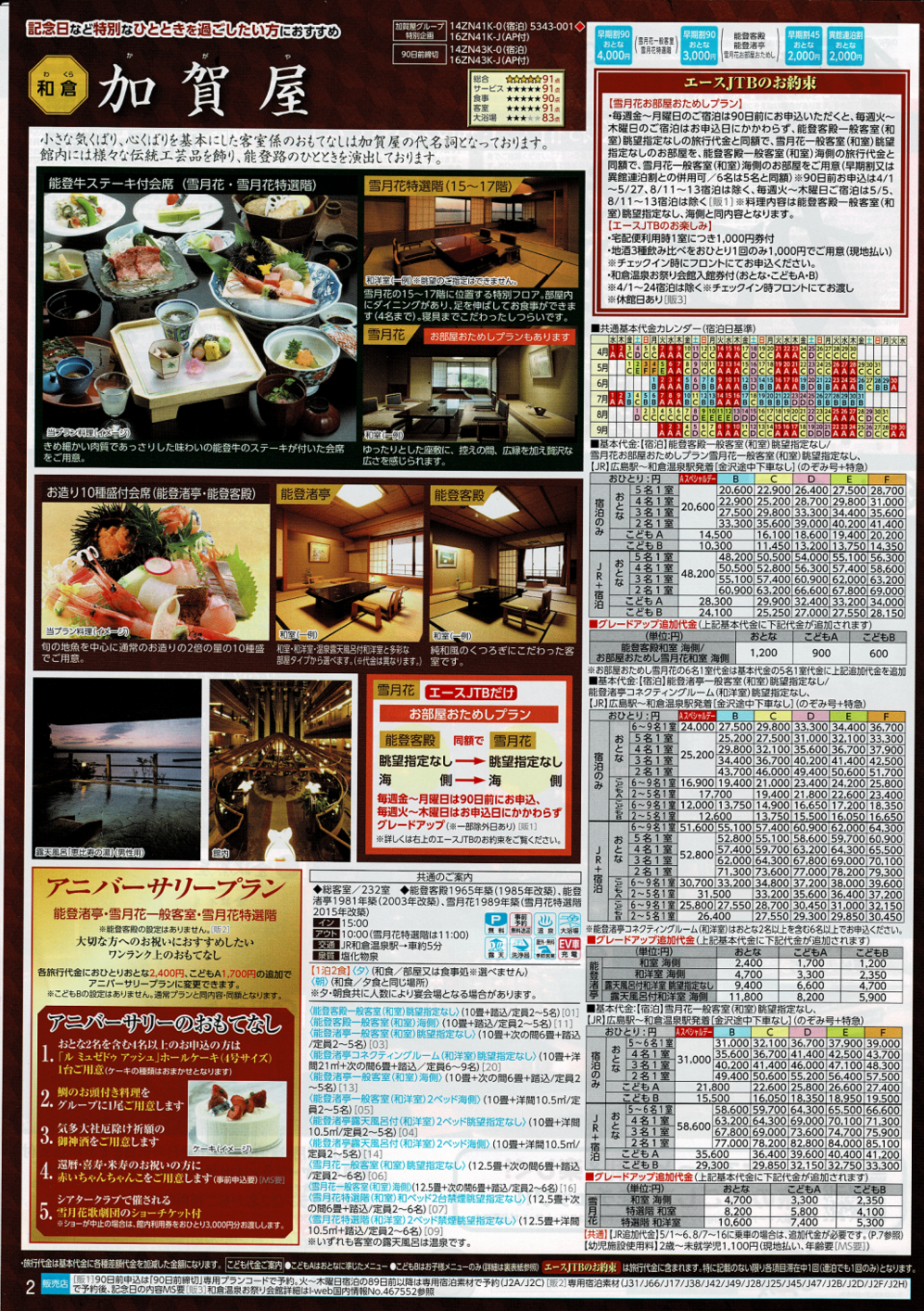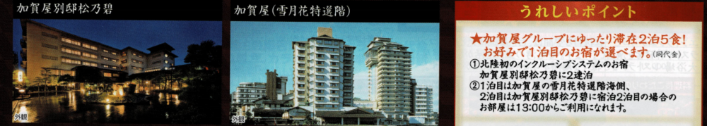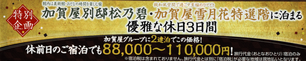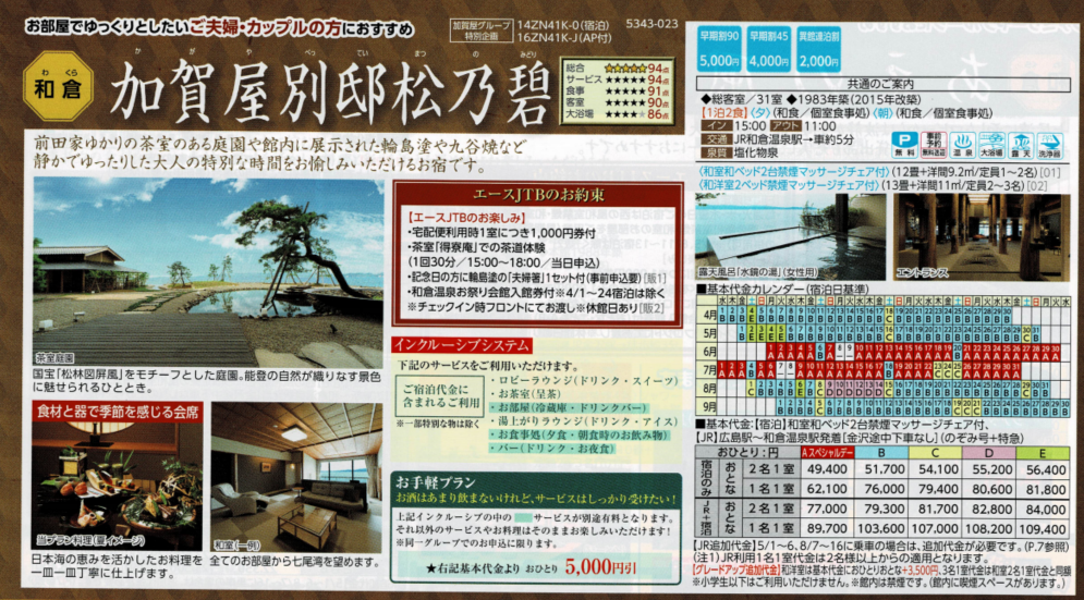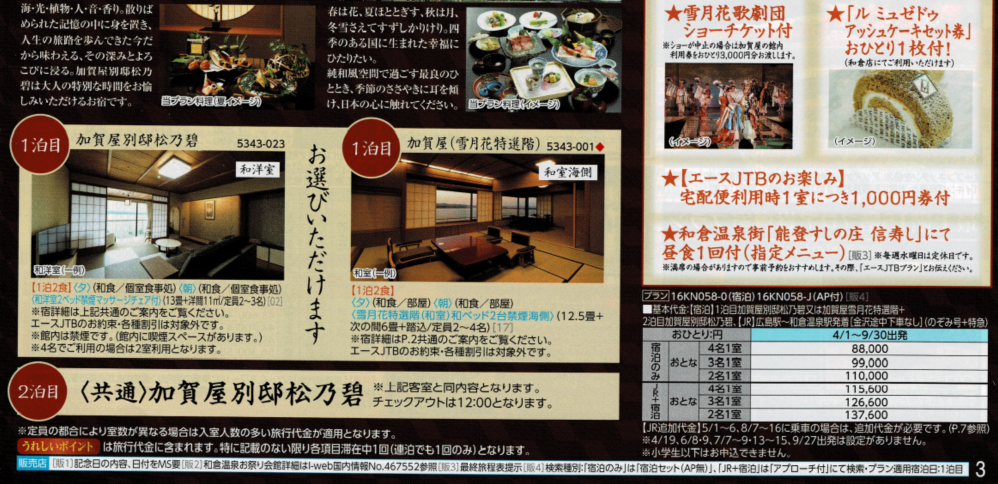 【料金例】 ●加賀屋別邸松乃碧・雪月花特選階に泊まる優雅な休日3日間 ●9月11日金曜日発2泊3日 ●大人2名 ●ホテル:和倉温泉 加賀屋別邸松乃碧・雪月花特選階 夕食×2、朝食×2 ●JR切符:高松駅発着のぞみ・サンダーバード(特急指定席) 金沢駅途中下車可能。 大人¥126,300×2名 ¥126,600-¥300(高松駅発着差額) 2泊3日2名 合計旅行代金¥252,600 助成額1名¥40,000(上限2泊分)×2名=¥80,000 旅行代金助成額¥28,000×2 クーポン支給額¥12,000(1,000円券12枚)×2 実質旅行代金¥172,600 ※8月21日現在でクーポン適用開始日は決定しておりません。 |