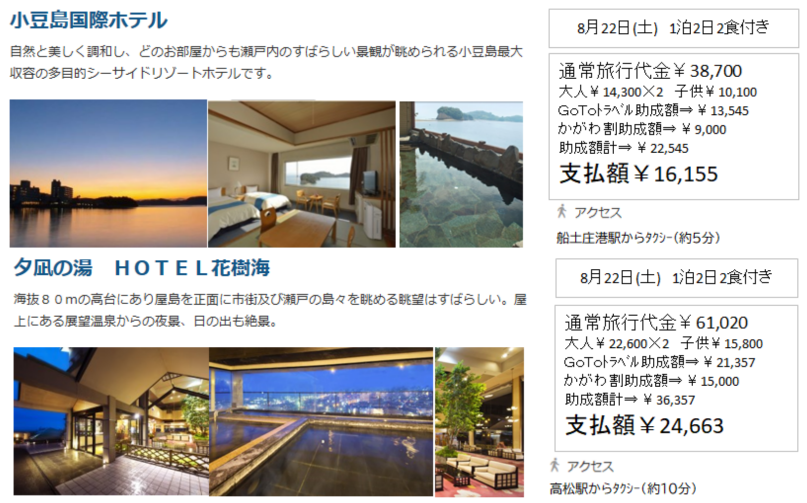 GoTo+かがわ割で助成額¥11,680(2名)